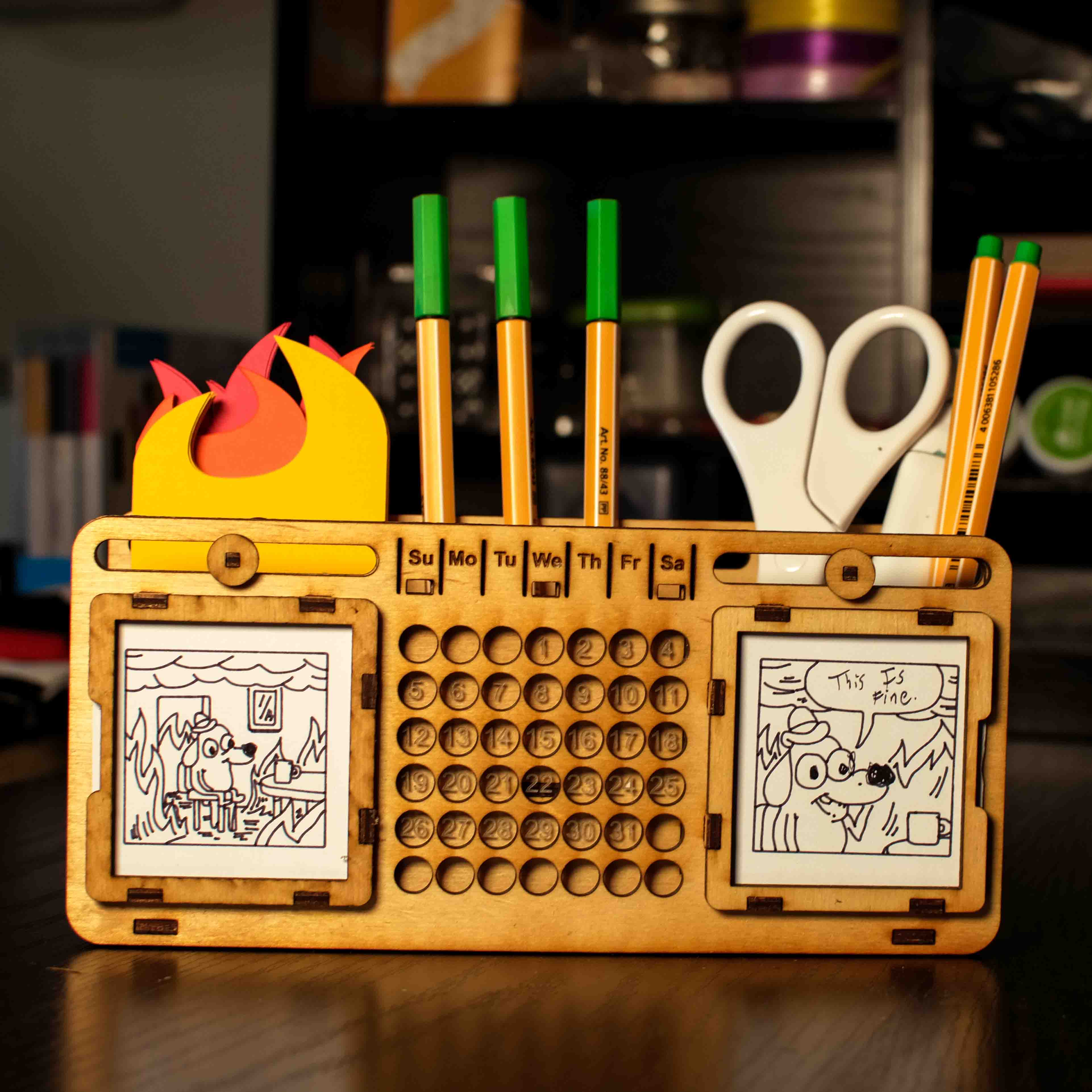 Desktop organizer featuring compartments for pens and pencils, perpetual calendar, and flame notecards to accompany every professional's favorite meme.
